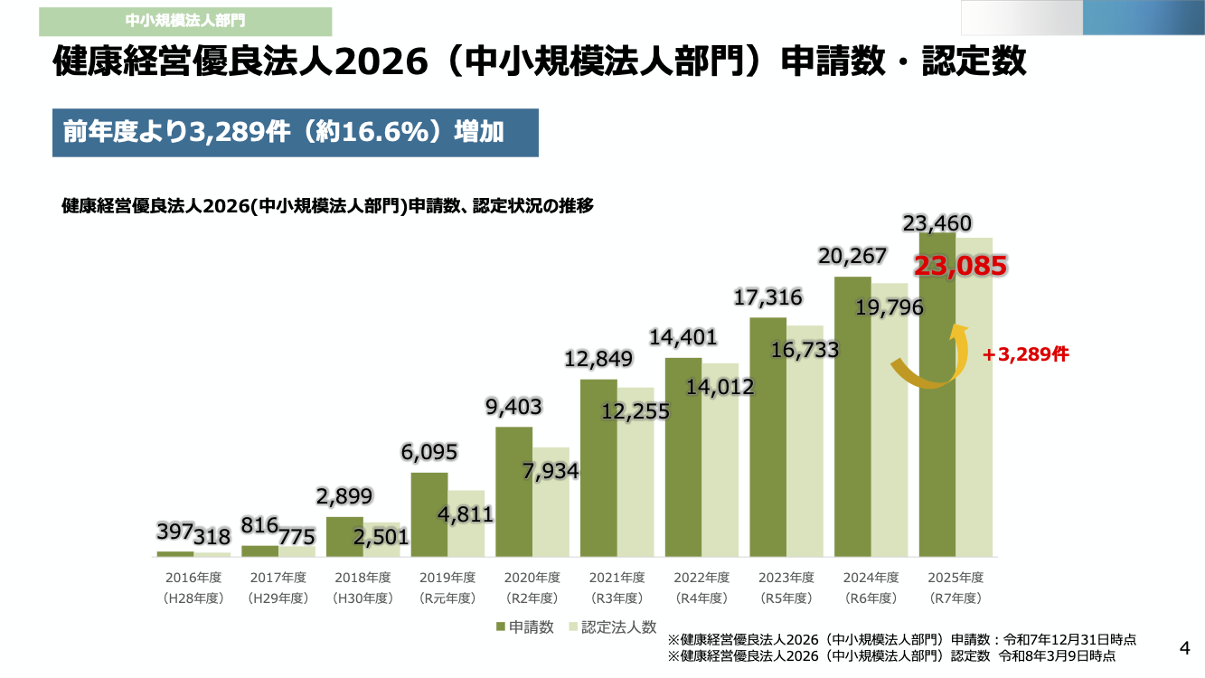 - 健康経営優良法人2026(中小規模法人部門):23,085法人(前年度比+3,289件、約16.6%増)