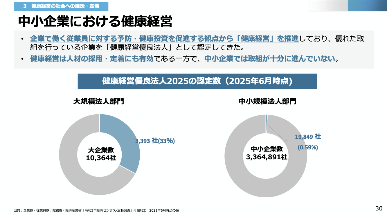 申請・認定数が増加している一方で、全中小企業に占める認定法人の割合はまだわずかです。第4回健康経営推進検討会(2025年12月)の資料によると、全中小企業数(約336万社)に占める健康経営優良法人(中小規模法人部門)の割合は0.59%にとどまっています(2025年12月1日時点の認定数をもとに算出。企業数は総務省・経済産業省「令和3年経済センサス‐活動調査」による)。大規模法人部門の普及率が約33%であることと比べると、中小企業への浸透はまだ途上にあります。