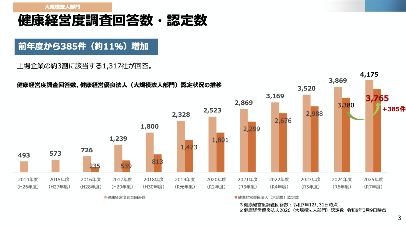 健康経営度調査の回答企業数は東証上場企業の約3割にあたります。制度開始から12年が経過し、大規模法人における一定の普及は続いています。