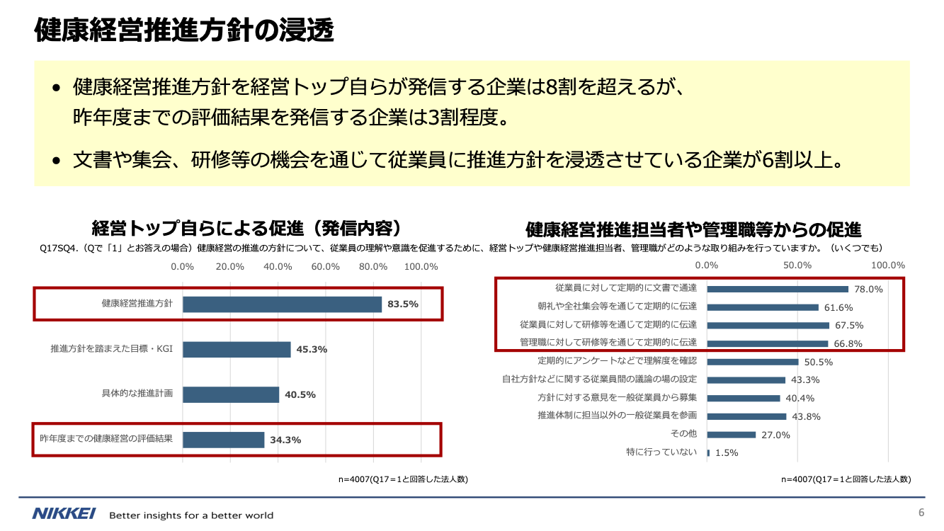 第4回健康経営推進検討会(2025年12月)で共有された令和6年度調査の結果によると、経営レベルの会議で健康経営を議題にしている企業は全体の78.5%にのぼります。